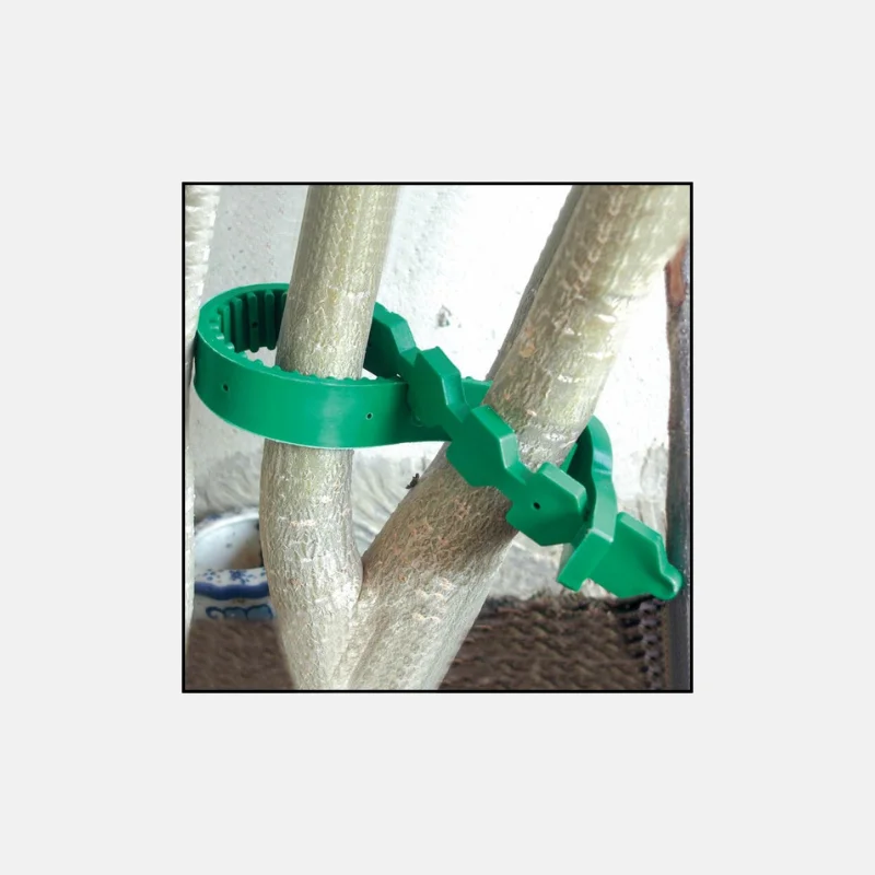 Attache plante verte en plastique rigide, mesurant 25 cm. Sa forme crantée permet un serrage ajustable et sécurisé autour des tiges sans les blesser. Idéale pour fixer les plantes à un tuteur ou à un support de manière rapide et propre.