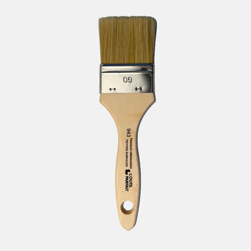 Polyvalent, précis et fluide : l’outil idéal pour peindre avec soin et efficacité. Marque : L’Outil Parfait Largeur : 60 mm Poils : fibres synthétiques claires haute qualité Manche : bois verni percé, solide, ergonomique, pratique à suspendre Utilisation : peintures, vernis, lasures – intérieur et extérieur Avantage : très bon équilibre entre finesse et couverture, idéal pour les zones moyennes Entretien : nettoyage facile à l’eau ou au solvant, selon le produit appliqué