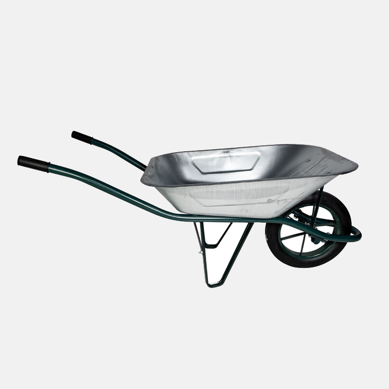 À l’avant de la brouette, une roue pneumatique en caoutchouc montée sur une jante en acier assure une maniabilité aisée sur divers terrains, qu’ils soient plats ou accidentés. Le châssis solide garantit une stabilité à toute épreuve, permettant le transport de charges lourdes sans nuire à l’intégrité de l’outil.