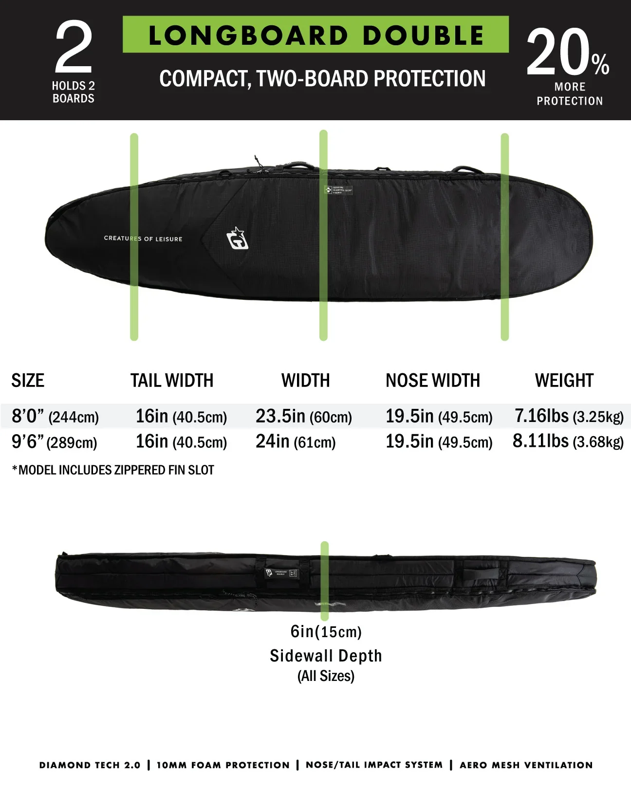 Designed for lightweight, compact travel. Our Longboard Double Covers fit your go-to board plus a back up in a streamlined shape. 10mm FOAM and DIAMOND-TECH materials add extra protection.